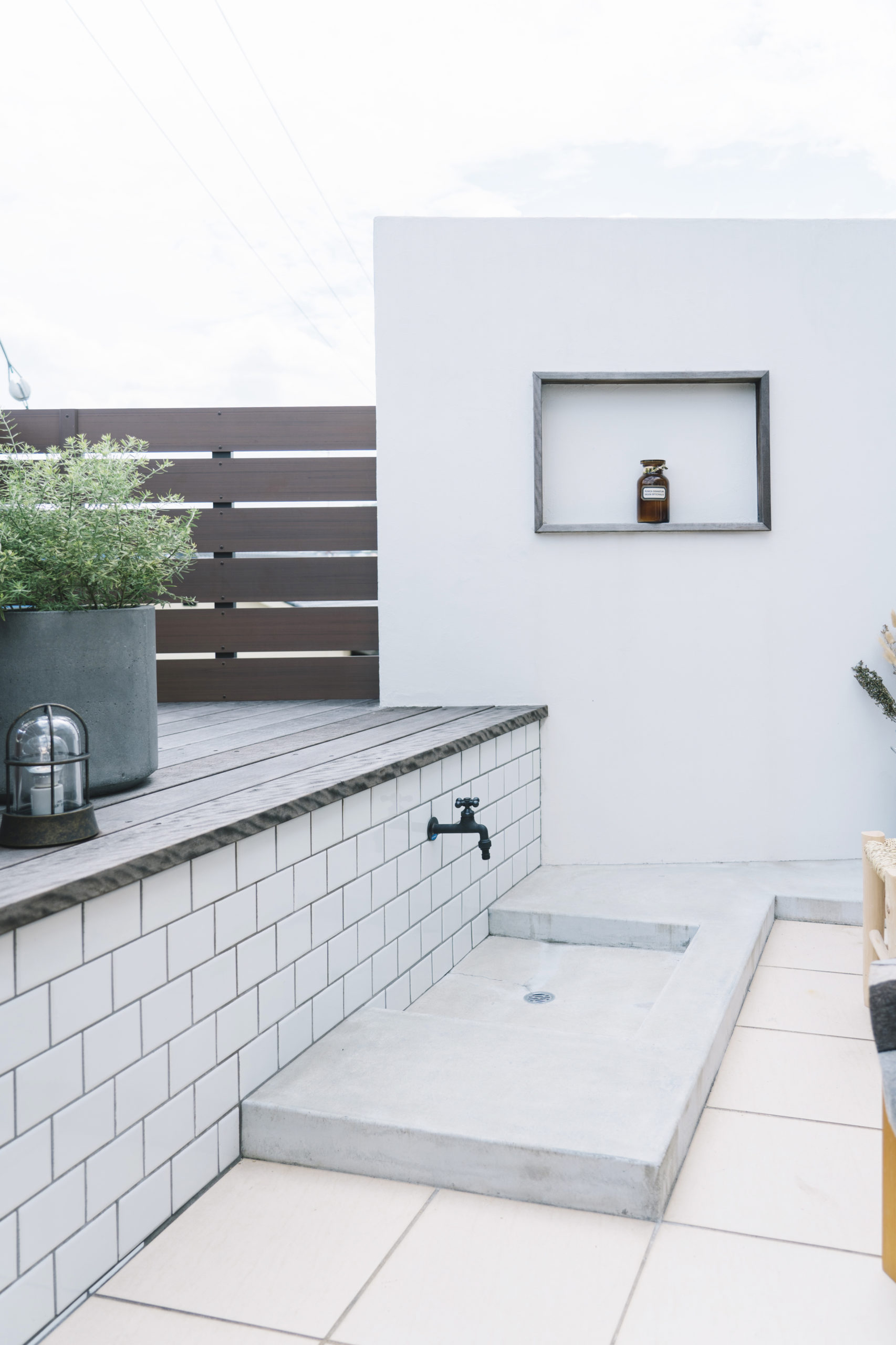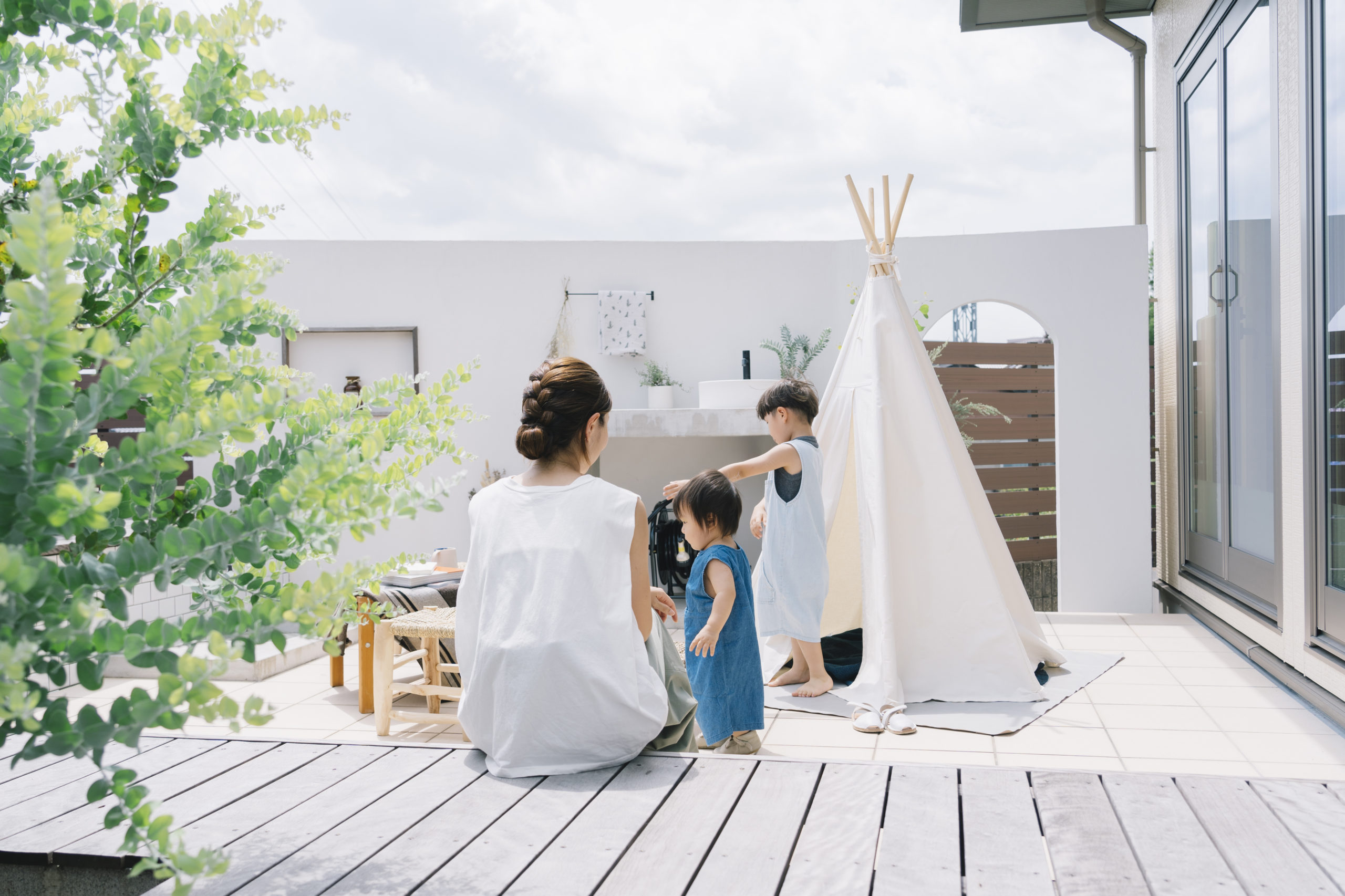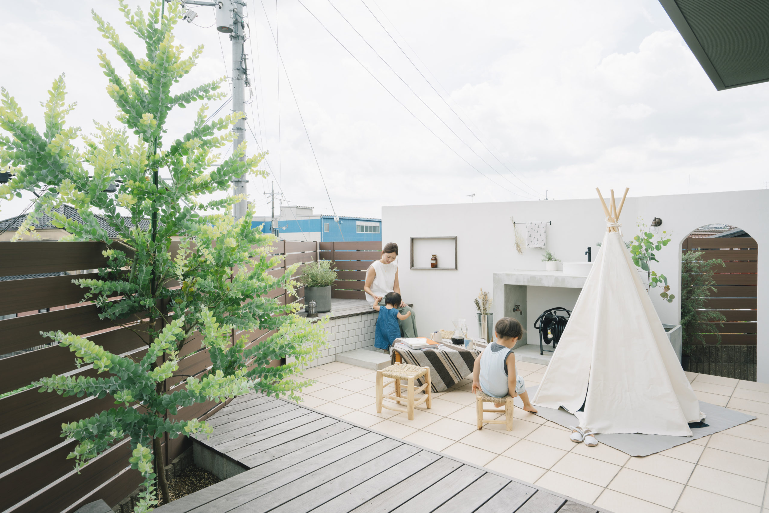 リノベーションで目指したのは、室内とゆるやかにつながり、家族が思い思いに過ごせる第二のリビングのような庭。シンプルでありながら、施主の暮らしやライフスタイルにとけこみ、時間を経ても飽きのこない空間である。室内からフラットにつながる、新たに設置したウッドデッキは、暮らしの延長として内と外をゆるやかにつなぎ、パールアカシアの優しい緑が視線をやさしく受け止め、庭に落ち着きと彩りを与えている。そこから一段下がったタイルデッキは、庭のスキップフロアのように広がり、ウッドデッキとの段差はベンチとしても機能する。座る場所を選びながら、それぞれの過ごし方に寄り添っている。またタイルデッキの一角にはガーデンシンクを設け、庭で簡単な食事の準備や片付けもできるようにした。その背後に立つ大きな白い塗り壁は、庭のアクセントであり、目隠しとしても心強い存在。切り取られたアーチの開口部からは、日常の中にわずかな非日常の気配が漂う。変形地を活かしてつくられた三角形のウッドベンチは腰掛けにもなり、小さなデッキとして子どもたちの遊び場としても活躍する。この第二のリビングのような空間は庭としてただ眺めるものではなく、季節を問わず、家族が集い、遊び、語らう。そんな風景が日々の暮らしの中にとけこんでいく、日々に寄り添う身近な場所として、家族とともに大切な時間を刻み、思い出を育むことのできる「過ごす場」となっている。