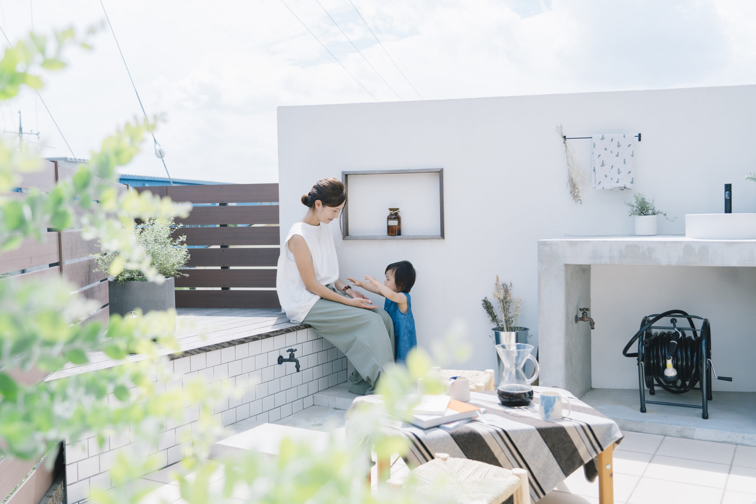 リノベーションで目指したのは、室内とゆるやかにつながり、家族が思い思いに過ごせる第二のリビングのような庭。シンプルでありながら、施主の暮らしやライフスタイルにとけこみ、時間を経ても飽きのこない空間である。室内からフラットにつながる、新たに設置したウッドデッキは、暮らしの延長として内と外をゆるやかにつなぎ、パールアカシアの優しい緑が視線をやさしく受け止め、庭に落ち着きと彩りを与えている。そこから一段下がったタイルデッキは、庭のスキップフロアのように広がり、ウッドデッキとの段差はベンチとしても機能する。座る場所を選びながら、それぞれの過ごし方に寄り添っている。またタイルデッキの一角にはガーデンシンクを設け、庭で簡単な食事の準備や片付けもできるようにした。その背後に立つ大きな白い塗り壁は、庭のアクセントであり、目隠しとしても心強い存在。切り取られたアーチの開口部からは、日常の中にわずかな非日常の気配が漂う。変形地を活かしてつくられた三角形のウッドベンチは腰掛けにもなり、小さなデッキとして子どもたちの遊び場としても活躍する。この第二のリビングのような空間は庭としてただ眺めるものではなく、季節を問わず、家族が集い、遊び、語らう。そんな風景が日々の暮らしの中にとけこんでいく、日々に寄り添う身近な場所として、家族とともに大切な時間を刻み、思い出を育むことのできる「過ごす場」となっている。